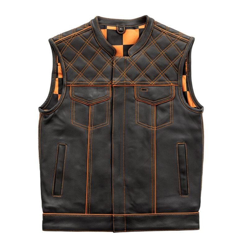 Men’s Leather Vest Orange Checker & Orange Thread Concealed Waistcoat