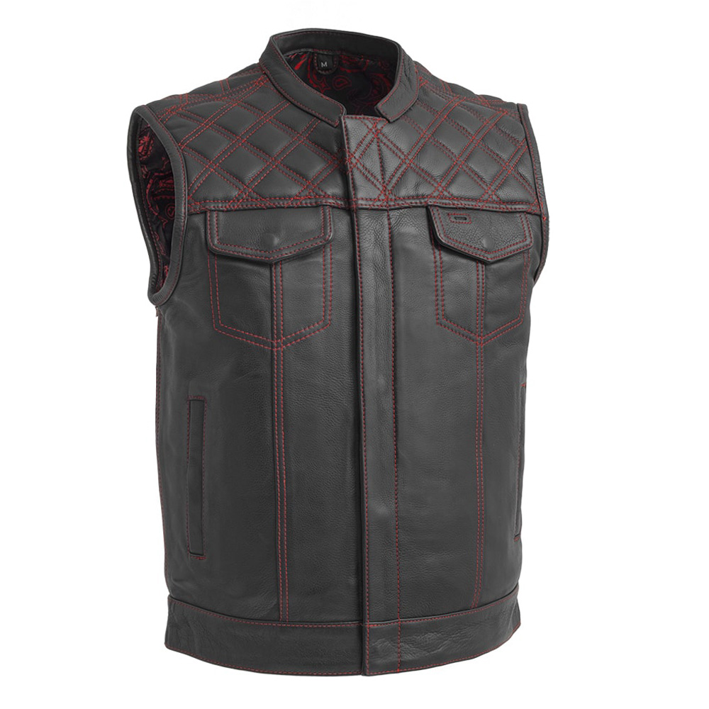 Men’s Black Leather Vest Diamond Motorbike Motorcycle Concealed Red Waistcoat