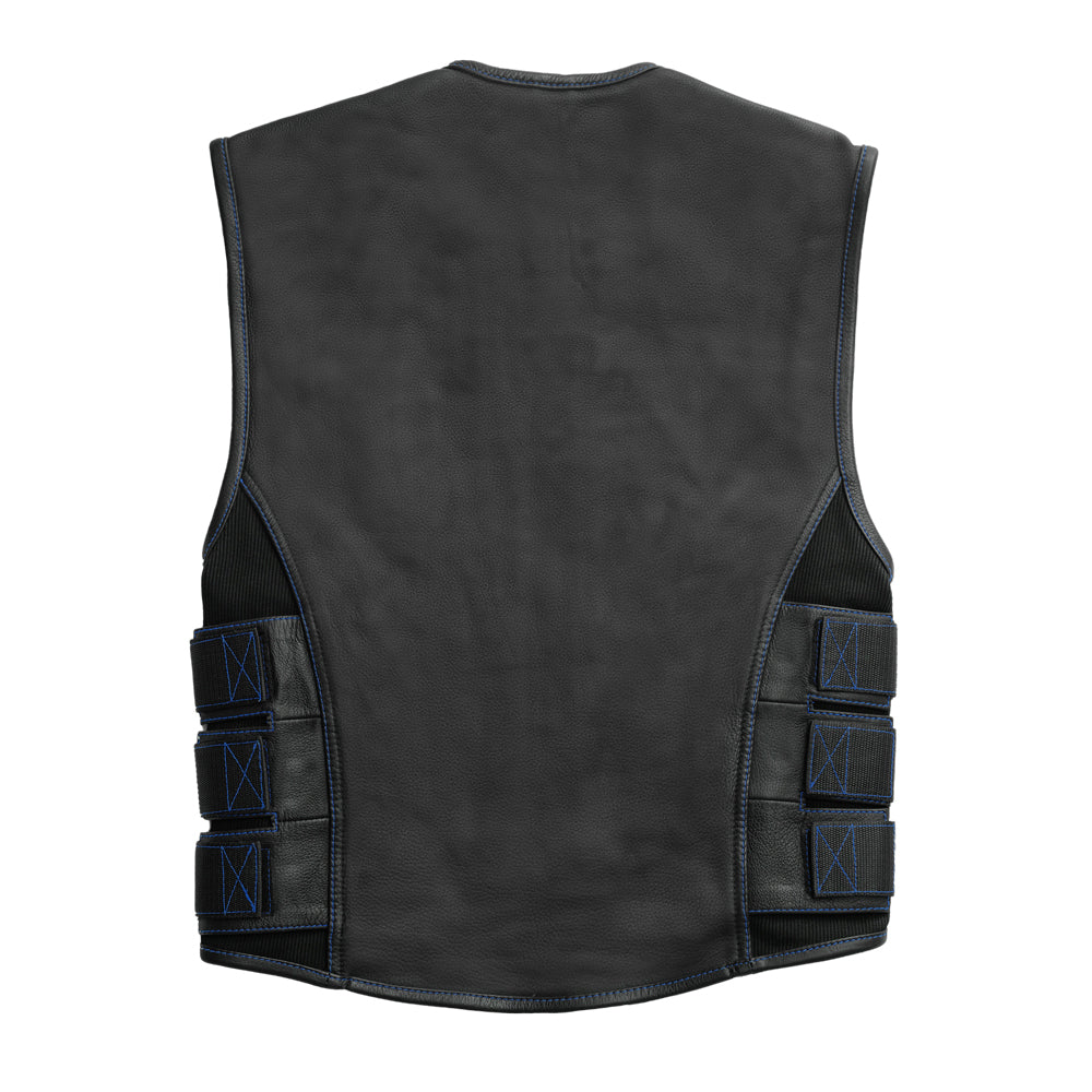 Men’s Swat Style Black Leather Vest W/ Blue Paisley Lining Motorbike Side Strap Waistcoat