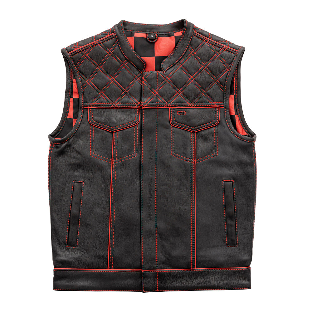 Our Finish Line Collection is a high-horsepower collection of vests! Available in a variety of colors, these checkered flag vests are ready to race. Crafted from Diamond Naked Cowhide, these club style vests rock a one inch collar, colored piping, covered snaps, and a cropped center zipper for comfort while riding. The three panel liner is a satin checkerboard fabric, that zips part way out for easy access to add patches. Lots of pockets, including two conceal carry pockets for everything you need to bring.