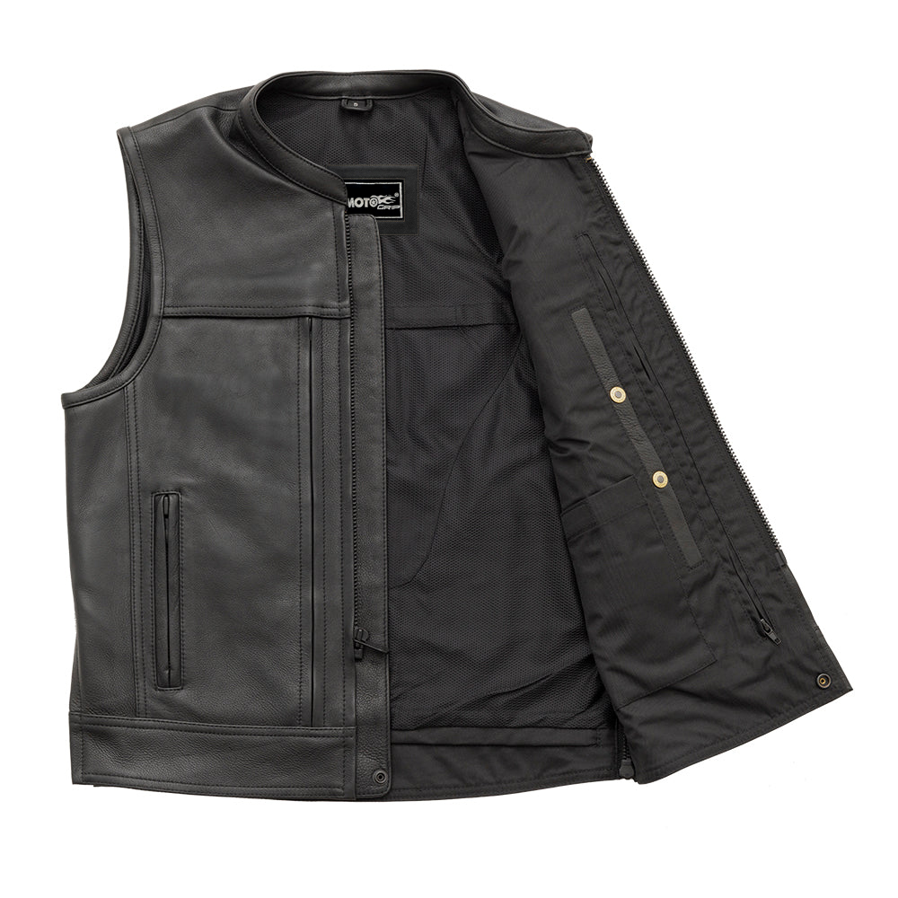 POCKETS! If you need extra pockets, the Rampage is for you. Crafted from Platinum Naked Cowhide, this club style vest has EIGHT hidden utility pockets under a zipper on the front of the vest. Plus, two conceal carry pockets, and an interior cellphone pocket. Side relief zippers allow for easy adjustments to be comfortable when seated on the bike. Oh, and all of the hardware is blacked out for a clean look.