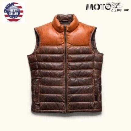Men’s Two Brown Colors Leather Puffer Vest Motorcycle Concealed Waistcoat