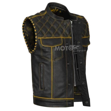 Men’s Black Leather Vest Diamond Motorbike Motorcycle Concealed Yelow Waistcoat