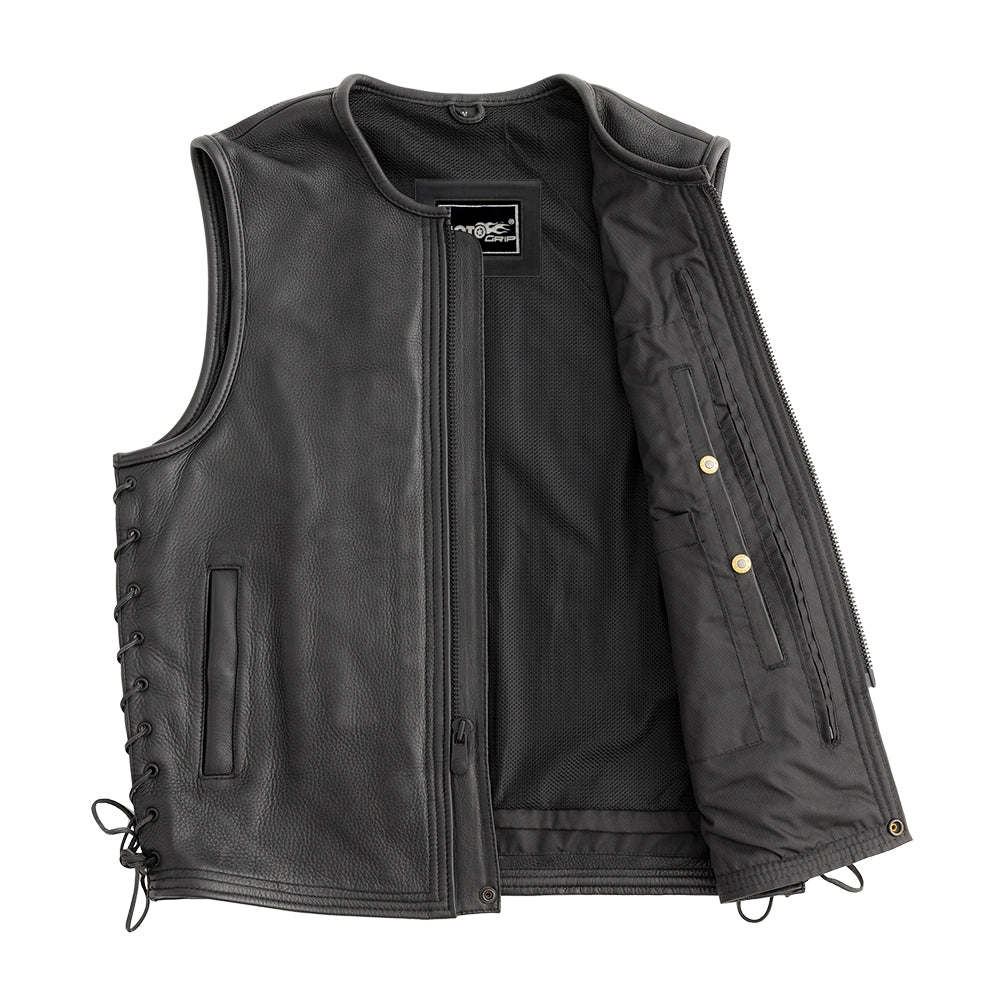 The Venom vest features a single, blacked out, visible center zipper up front with two slash pockets. It’s got side lacing, making it easy to adjust the fit when seated on your motorcycle. It has mesh lining with easy access panels to add patches to the single back panel. It’s crafted from Platinum Naked Cowhide, so it’s heavy duty enough to give you great protection out on the road.