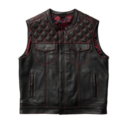 Men’s Biker Leather Vest Hunt Club Black Leather Red Diamond Red Paisley Motorcycle Vest