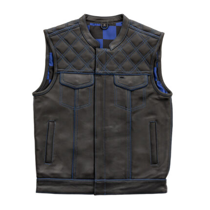MotoGrip Men’s Leather Vest Blue Checker & Orange Thread Concealed Waistcoat